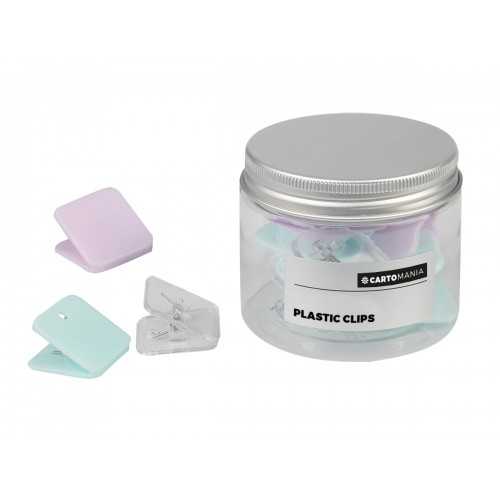 Un simpatico kit scrivania rotondo, con 8 clips ferma fogli in plastica nei colori misti di lilla e verde acqua.