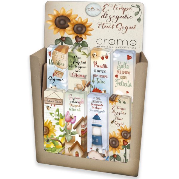 Formato: 5 x 17 cm. Segnalibri in cartoncino laminato Decorati con vernice trasparente Retro a colori Assortiti in 8 soggetti Espositore da banco con 64 segnalibri Dimensione espositore: 24,5 x 44 x 13,5 cm.