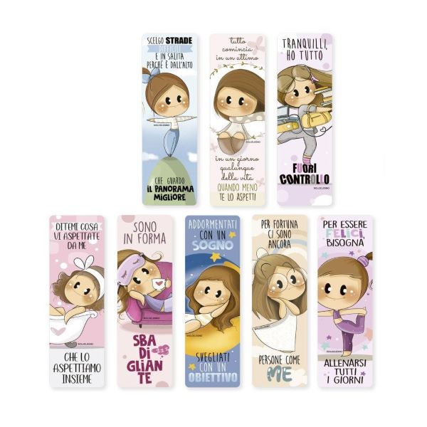 Formato: 5 x 17 cm. Segnalibri in cartoncino laminato Decorati con vernice trasparente Retro a colori Assortiti in 8 soggetti Espositore da banco con 64 segnalibri Dimensione espositore: 24,5 x 44 x 13,5 cm.