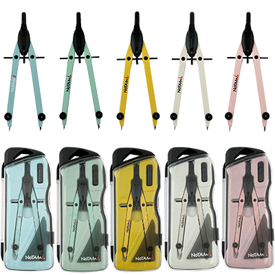 Realizzato in metallo verniciato di colore bianco con scatola in plastica nera, sistema di apertura con regolazione micrometrica, lunghezza mm. 160, apertura massima mm. 145 per cerchi di diametro massimo mm. 280, completo di tubetto portamine.