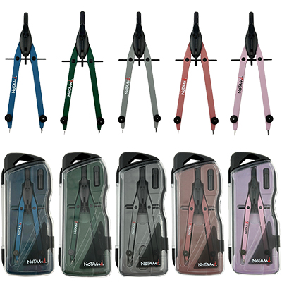 Realizzato in metallo verniciato di colore bianco con scatola in plastica nera, sistema di apertura con regolazione micrometrica, lunghezza mm. 160, apertura massima mm. 145 per cerchi di diametro massimo mm. 280, completo di tubetto portamine.