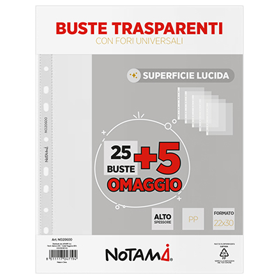 Confezione speciale di buste a fori universali a finitura liscia, nella specialissima offerta risparmio 25 buste più 5 omaggio. Spessore pesante.