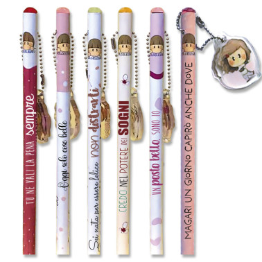 Assortite in 6 soggetti Con Bubina pendente circa 2 x 3 cm. Ogni matita è decorata con una pietrina colorata Gradazione HB Dimensione espositore: 18 x 18,5 x 9,5 cm.