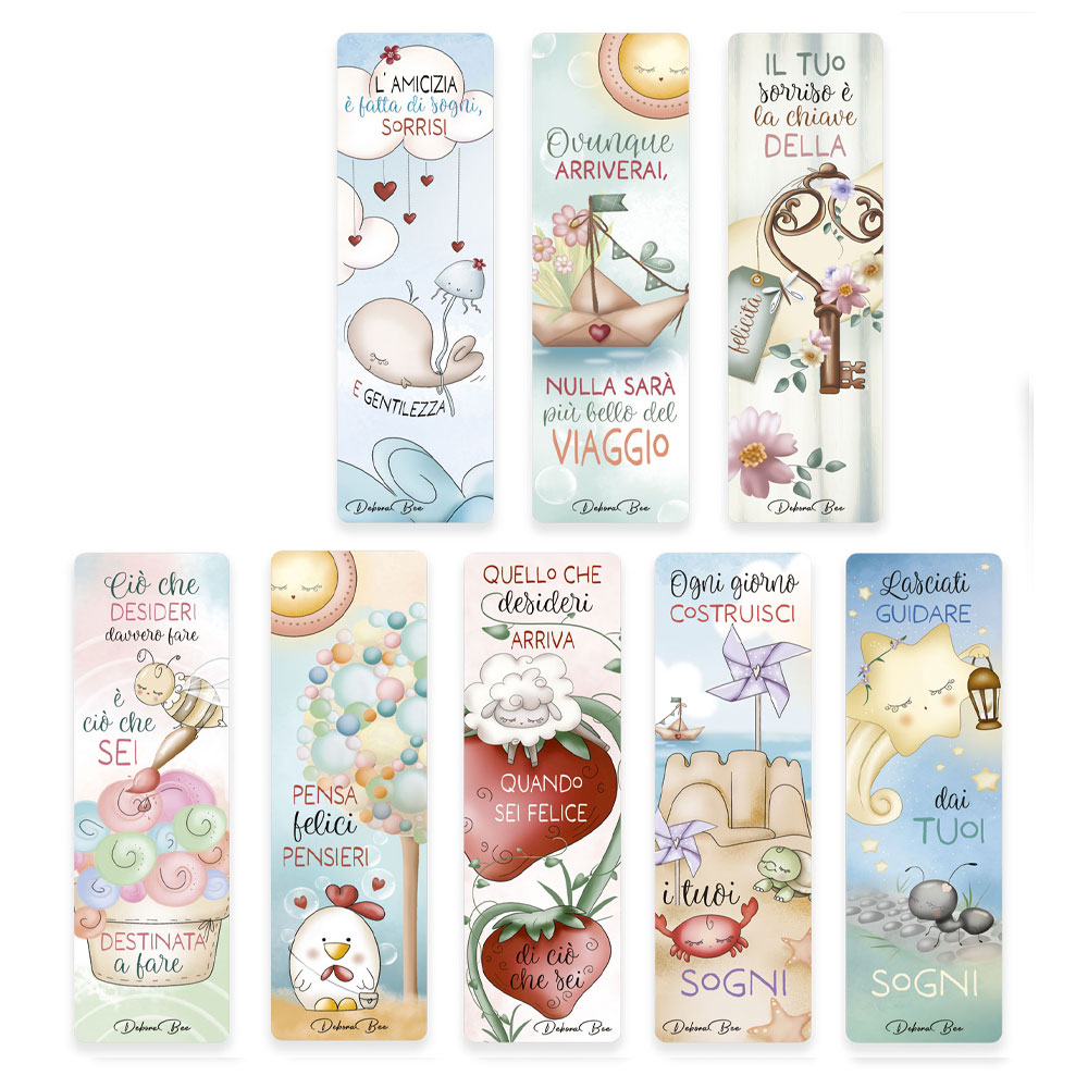 Formato: 5 x 17 cm. Segnalibri in cartoncino laminato Decorati con vernice trasparente Retro a colori Assortiti in 8 soggetti Espositore da banco con 64 segnalibri Dimensione espositore: 24,5 x 44 x 13,5 cm.