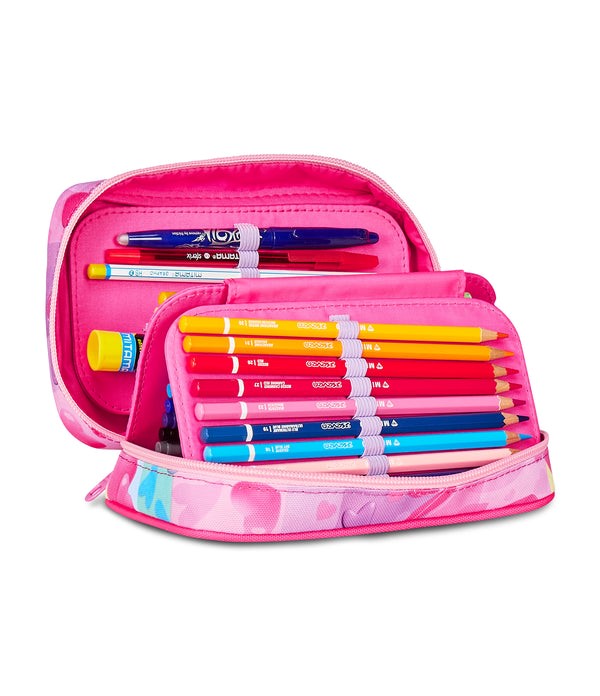 Apertura singola tramite zip, plance amovibili, elastici interni per cancelleria. CONTENUTO 44 PEZZI: 1 penna cancellabile BLU, 1 penna sfera rossa, 18 pastelli a colori 4.0 esagonali, 18 pennarelli superlavabili punta 3.0, 1 matita grafite esagonale HB, 1 colla gialla azzurra, 1 gomma bianca con cartoncino stampato, 1 temperino barilotto 2 fori, 1 righello trasparente azzurro, 1 paio di forbici in metallo con maniglia in plastica